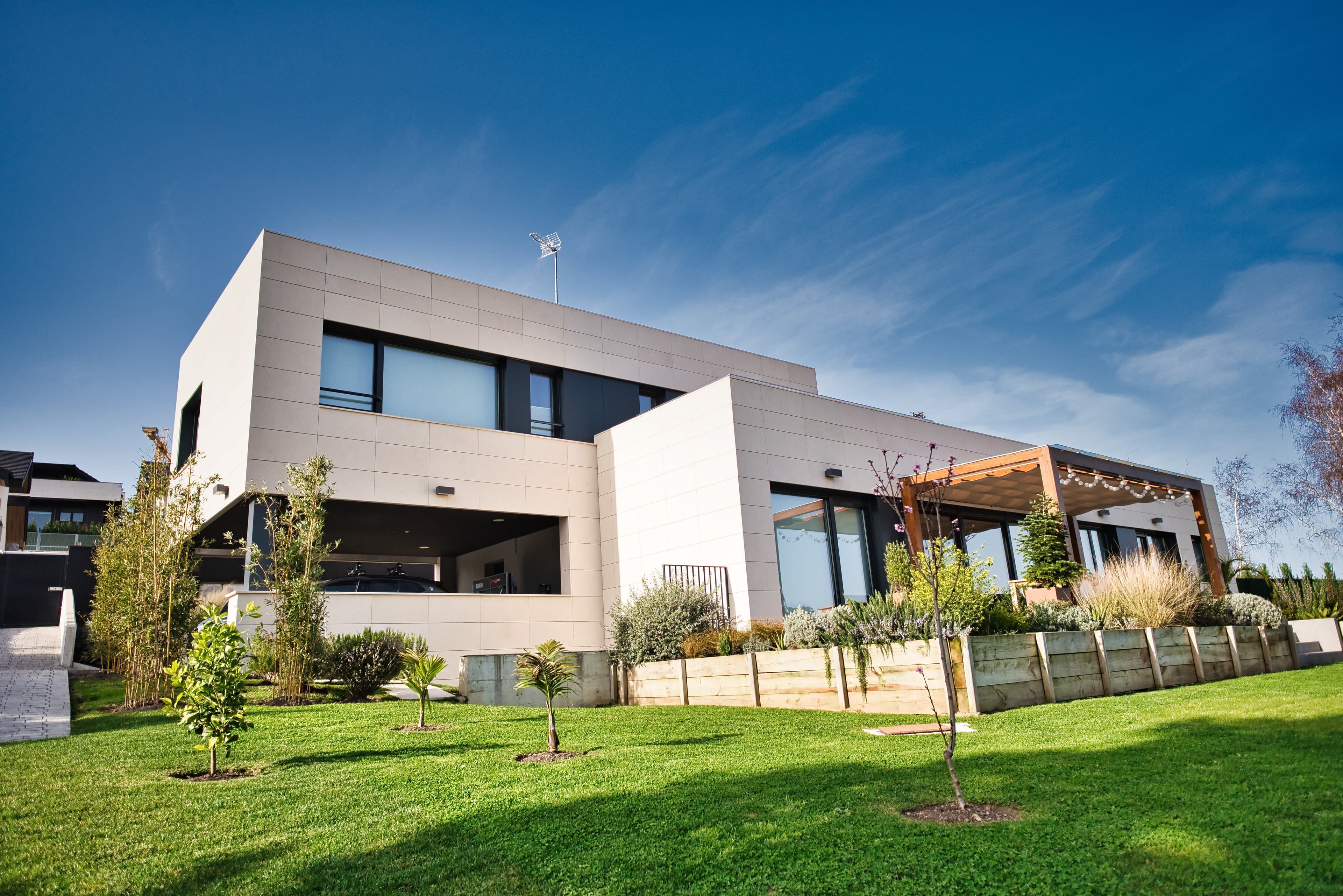 Una gran terraza cubierta parcialmente por una pérgola para protección solar, recorre la fachada sureste de la edificación en conexión con el salón, la cocina, el despacho y el dormitorio.